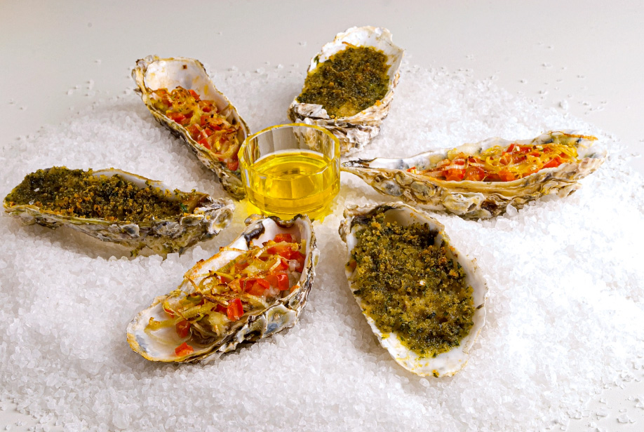 Huitre creuse marinée raifort poireaux menthe, émincé d’herbes du jardin.